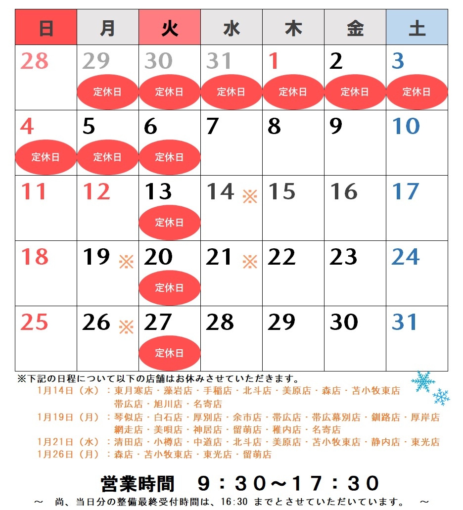 1月は下記日程が定休日となります。あらかじめご了承ください。