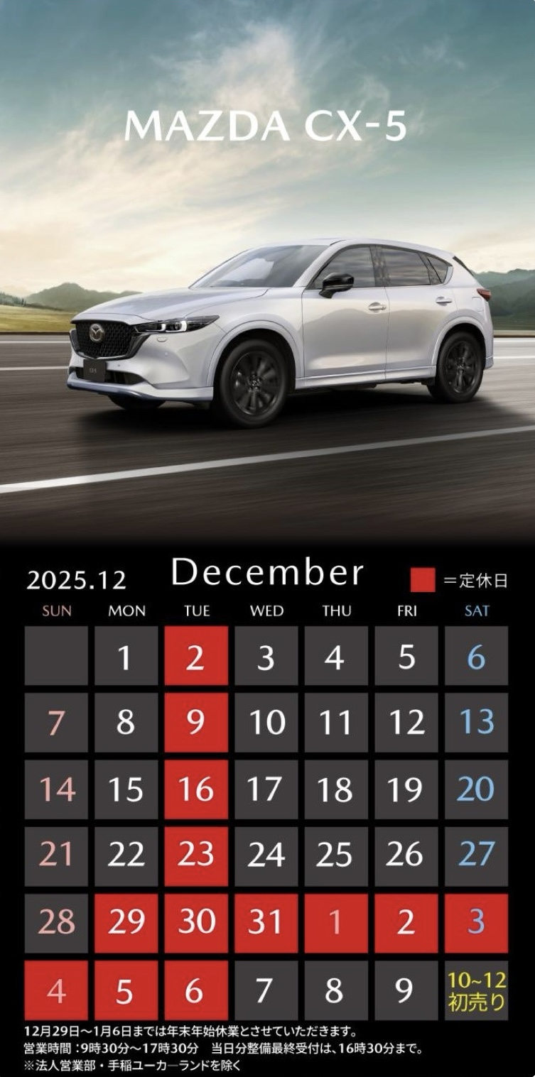 年末年始休業は12月29日(月)~1月6日(火)です。