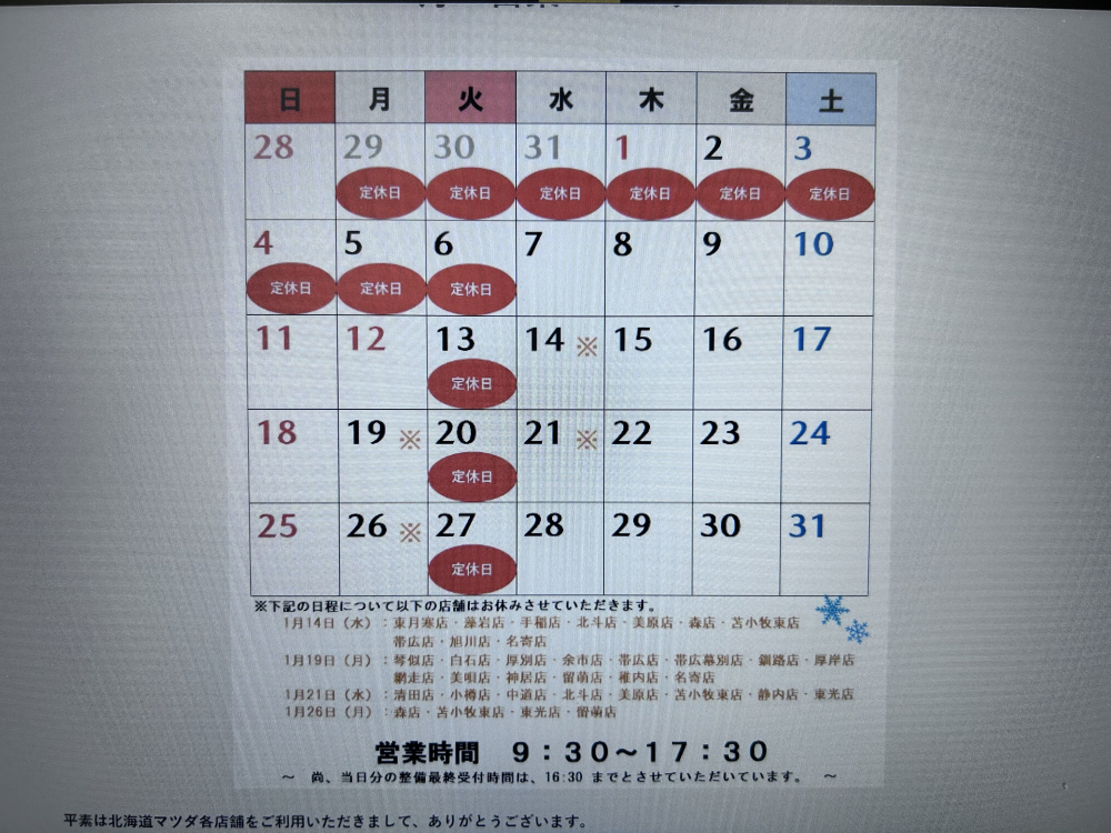 年内の営業日は28日(日)※整備受付は14時までとし、