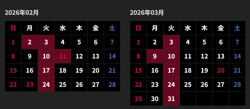 西町店では赤い枠のお休みの他に
