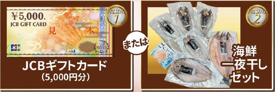 また、期間中にご成約頂いた方にはJCBギフトカード5,000円分か海鮮一夜干しセットの選べるプレゼントが当たります!!!