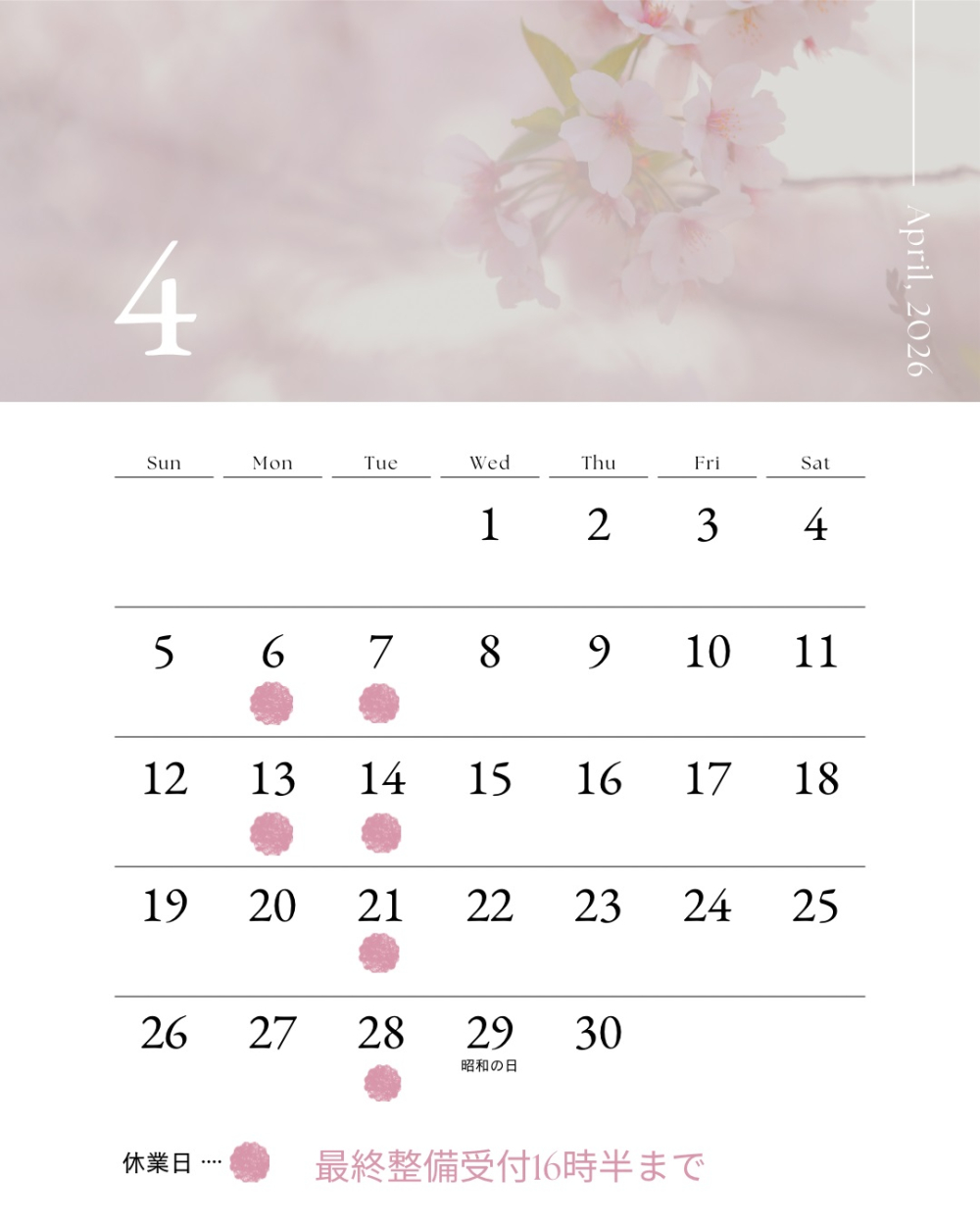 鉄粉落とし&タイヤ交換のお知らせの次は、定休日のご案内です。