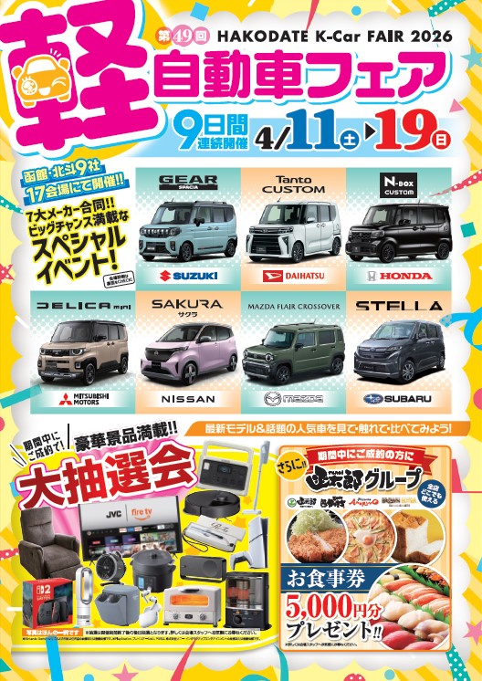 このイベントは、7大メーカー合同開催となっており、函館・北斗市内のディーラー17店舗にて開催されます。