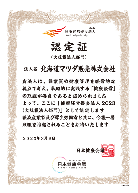 社員の健康を増進し、快適な職場環境の形成を促進しながら創立80周年を目指して、北海道の「マツダディーラー」として今後もより一層健康経営を推進して参ります。