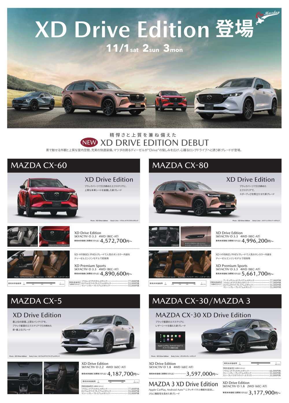 黒で魅せる外観と上質な室内空間、充実の快適装備。マツダの誇るディーゼルが“Drive”の愉しみを広げ、心躍るロングドライブへと誘う新グレードが登場。