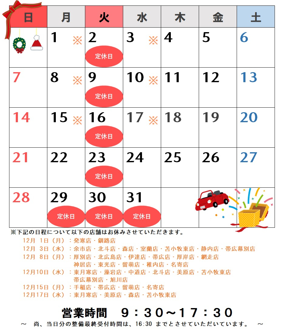 12月は下記日程が定休日となります。あらかじめご了承ください。