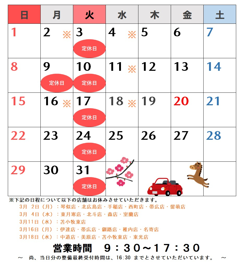 3月は下記日程が定休日となります。あらかじめご了承ください。