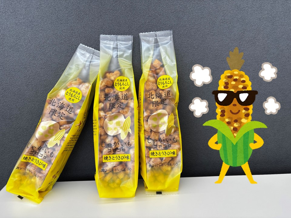 北海道産の良質なじゃがいもをもち米と一緒につき上げ、乾燥・熟成して揚げたおかきを北海道名物のひとつ、焼きとうきびの味に仕上げたお菓子です★