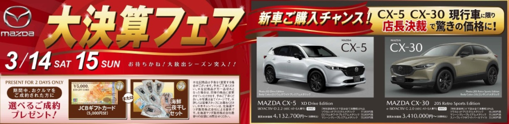決算ならではの新車特別価格販売(CX-5,CX-30)や
