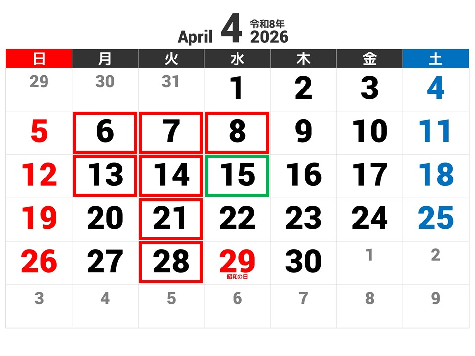 また、15日(水)についてはサービスのみ休業となりますので、ご了承下さい。
