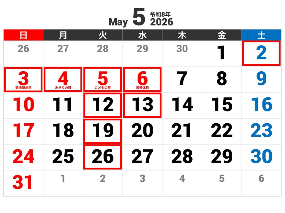 5月の休業日のお知らせ