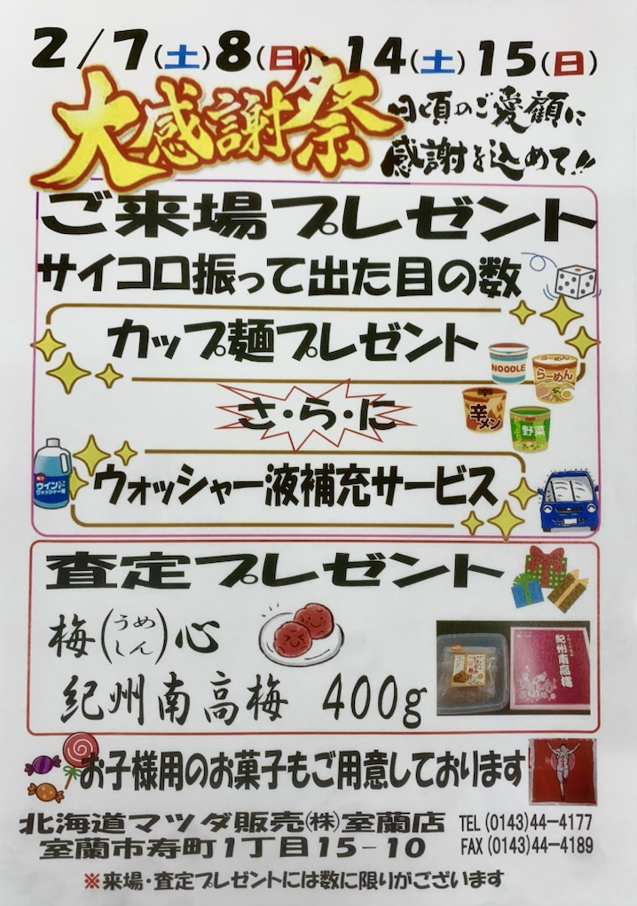 2月7日(土)、8日(日)/14日(土)、15日(日)の2週にわたり、いつもお車の点検・車検等のご入庫やお車ご成約して頂いているお客様に日頃のご愛顧に感謝を込めて、「北海道マツダ室蘭店大感謝祭」を開催致します!