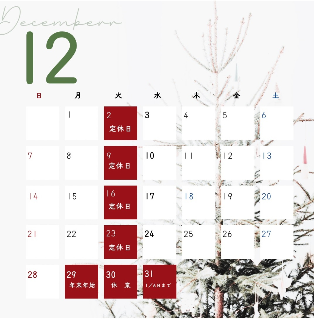 毎週火曜日と年末年始(12/29(月)~R8.1/6(火)までとなっております。