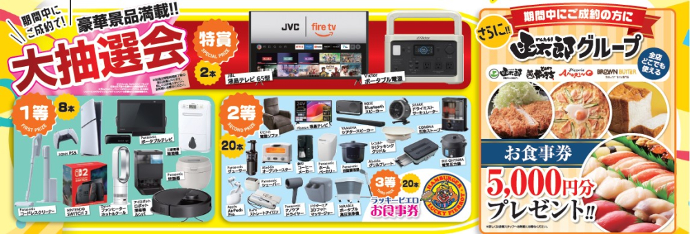 更に!期間中ご成約頂いた方には、テレビやゲーム機、調理家電など豪華景品が当たる・・・