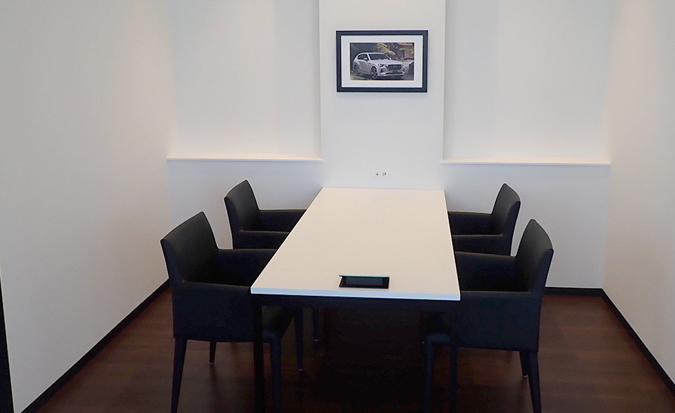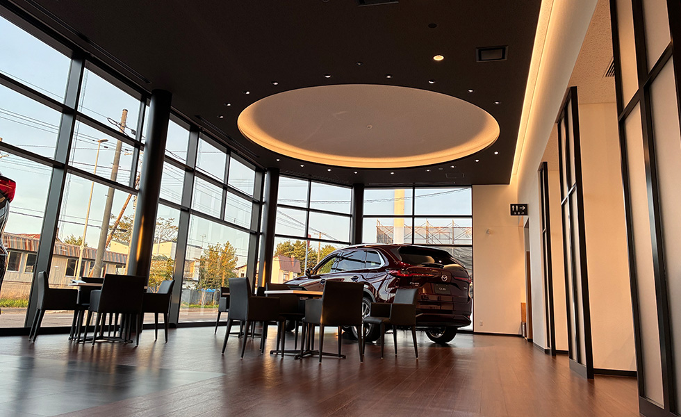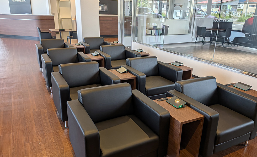 ゆったりとした商談スペースや待合ラウンジを備え、点検の待ち時間も快適にお過ごしいただけます☕