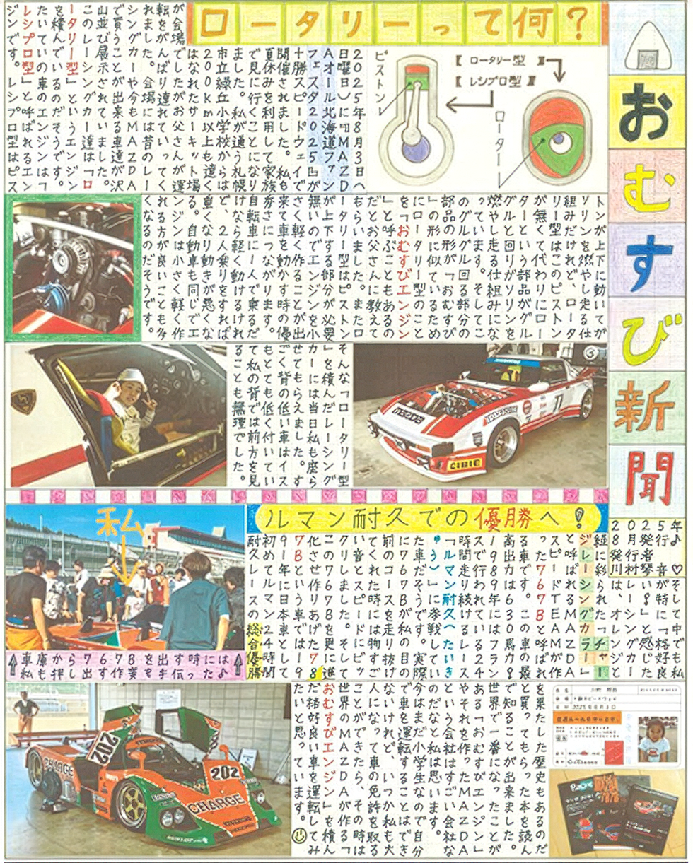 「おむすび新聞」には、琴音さんがイベントで見て、聞いて、感じたことがぎゅっと詰まっていました。家に帰ってから調べた「ロータリーエンジン=おむすびエンジン」と「レシプロエンジン」の違いや、将来“おむすびエンジン”のクルマに乗りたいという夢(是非実現して欲しいですね)。そして、オレンジと緑のカラーリングに魅了された767B。琴音さんが767Bの車庫出しを手伝った体験も書いてくれました。
