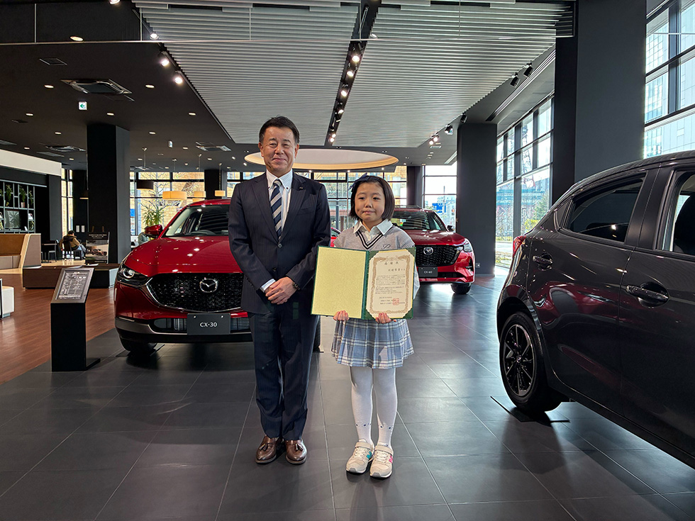この心温まる「おむすび新聞」を届けてくれたお礼として、先日、琴音さんへ感謝状と記念品を北海道マツダ営業本部長 千葉よりお渡しさせていただきました。