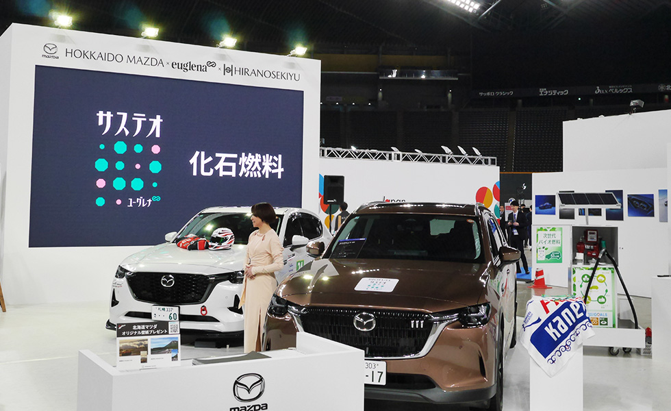 北海道マツダブースは、株式会社ユーグレナ様・平野石油株式会社様のご協力のもと、次世代バイオディーゼル燃料を中心とした環境への取り組みをご紹介しました。